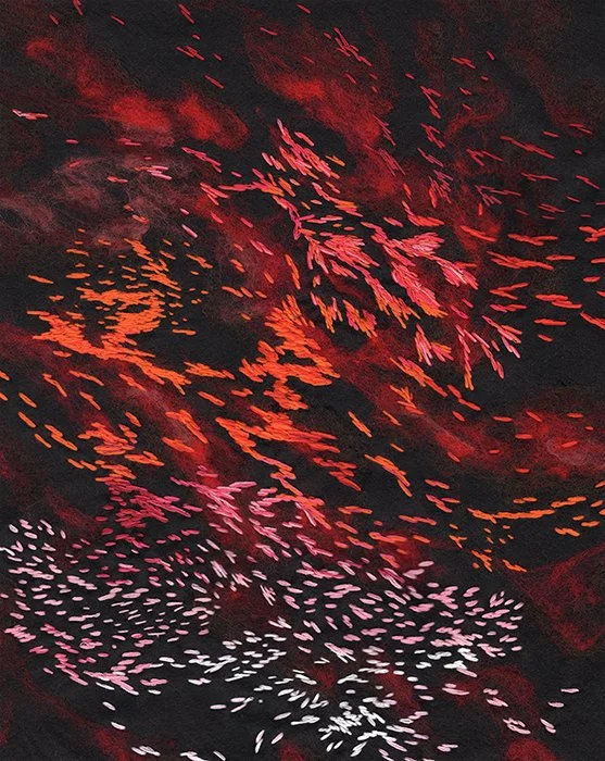 Seeing the Spirits of Red Giants (Watercolor and Embroidery) 16in x 20in Stretched Canvas Panel. This is a stand-alone piece inspired by the cosmos and red planets.